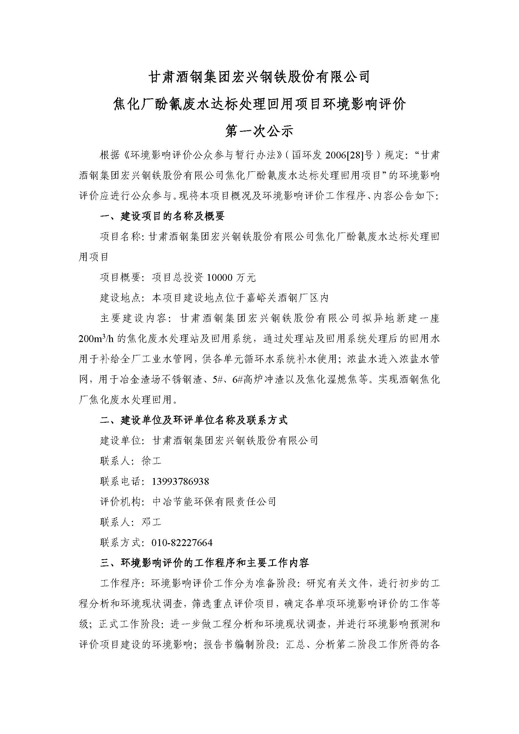 甘肅酒鋼集團宏興鋼鐵股份有限公司焦化廠酚氰廢水達標處理回用項目環(huán)境影響評價第一次公