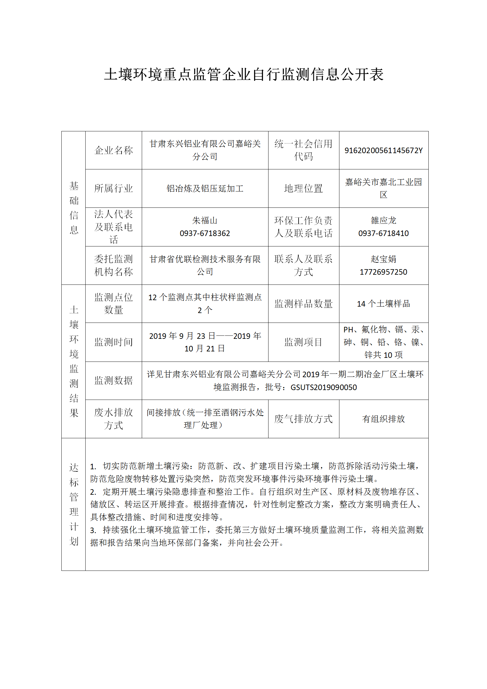 甘肅東興鋁業(yè)有限公司嘉峪關(guān)分公司2019年一期二期冶金廠區(qū)土壤環(huán)境監(jiān)測信息公開