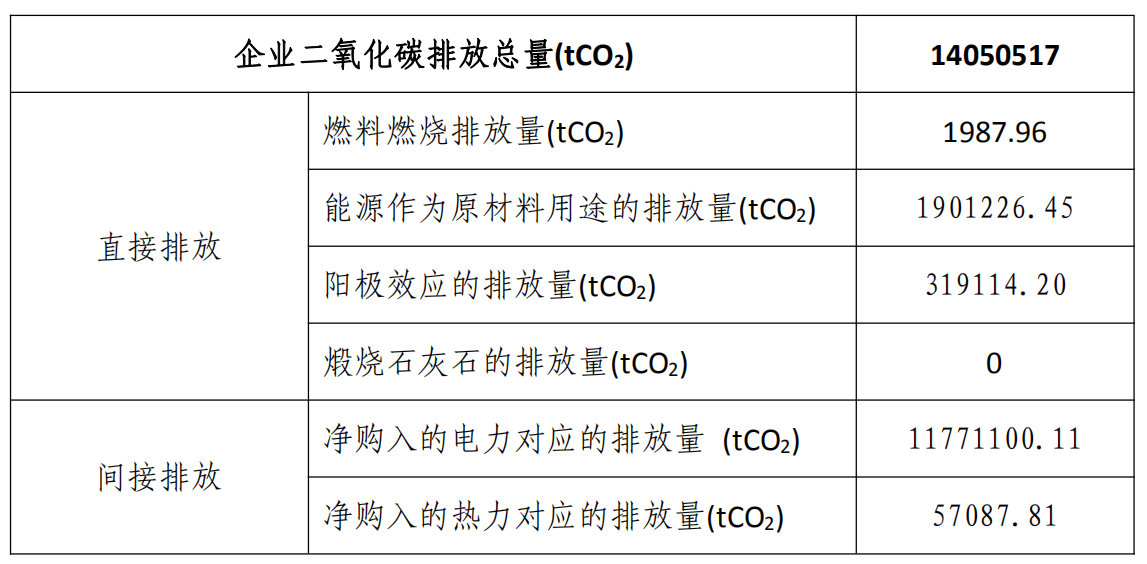 甘肅東興鋁業(yè)有限公司嘉峪關(guān)分公司 2018 年溫室氣體排總量為 14050517 tCO2,其中燃料燃燒排放量 1987.96tCO2,能源作為原材料用途的排放量 1901226.45 tCO2,工業(yè)生產(chǎn)過(guò)程排放量 319114.20 tCO2,凈購(gòu)入的電力對(duì)應(yīng)的排放量 11771100.11tCO2,凈購(gòu)入的熱力對(duì)應(yīng)的排放量 57087.81 tCO。