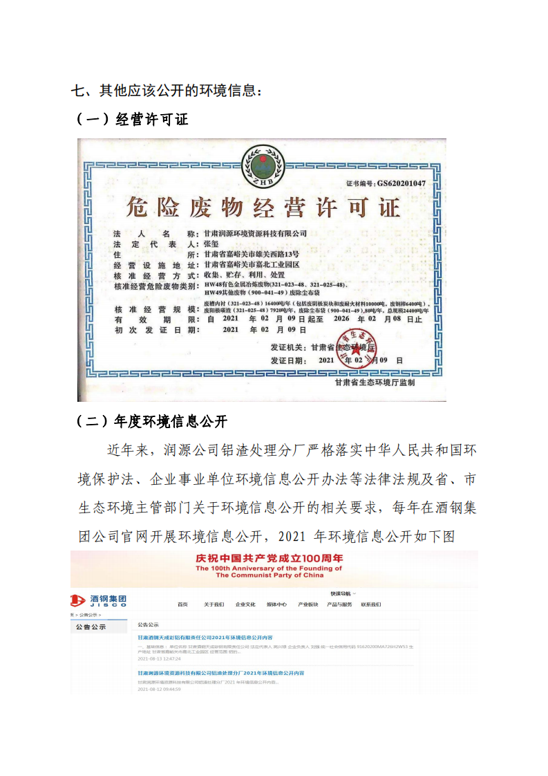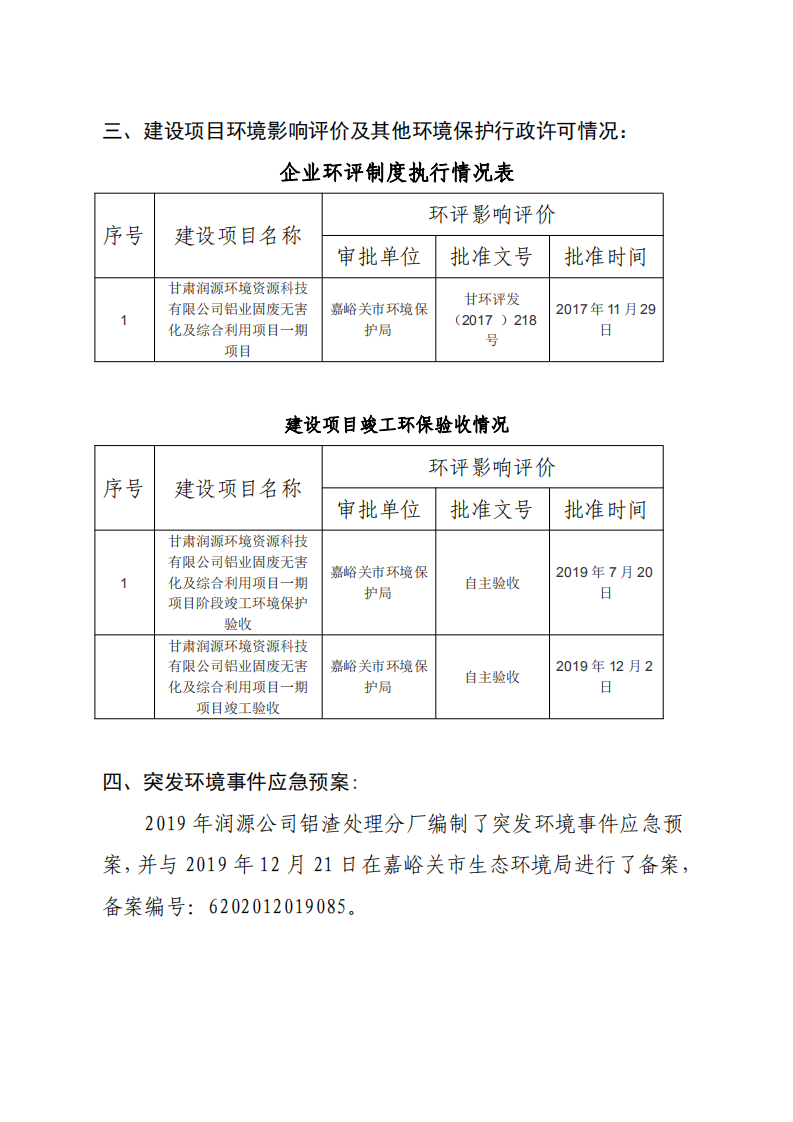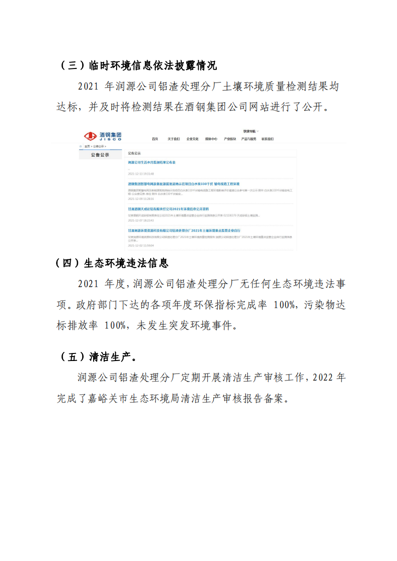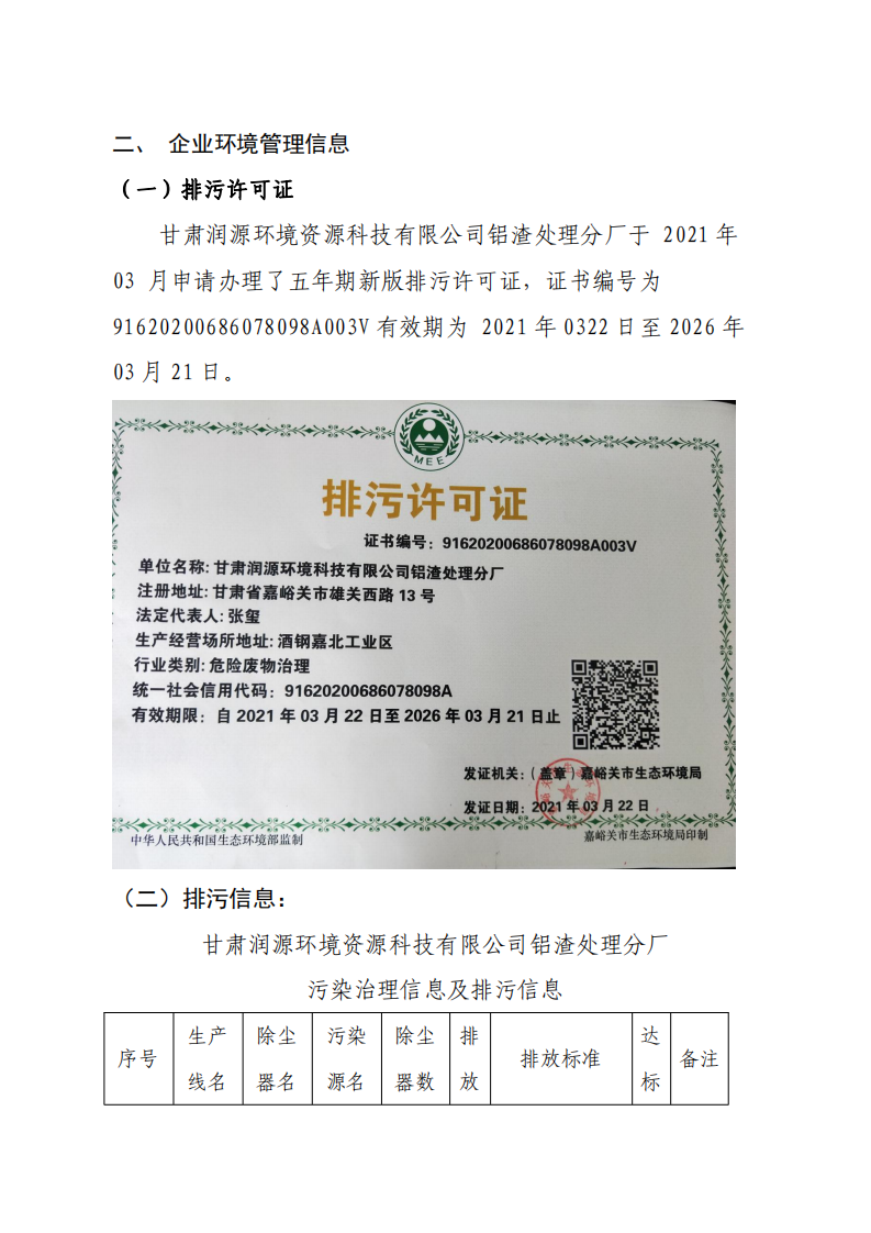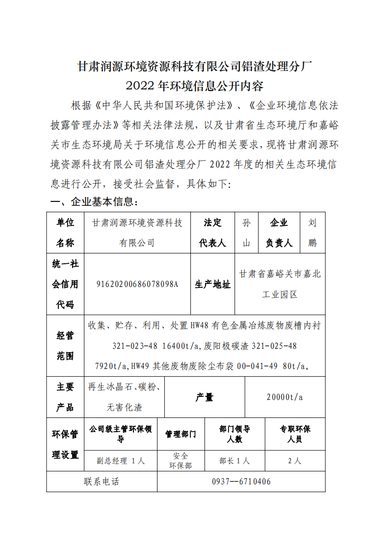 甘肅潤(rùn)源環(huán)境資源科技有限公司鋁渣處理分廠2022年環(huán)境信息公開
