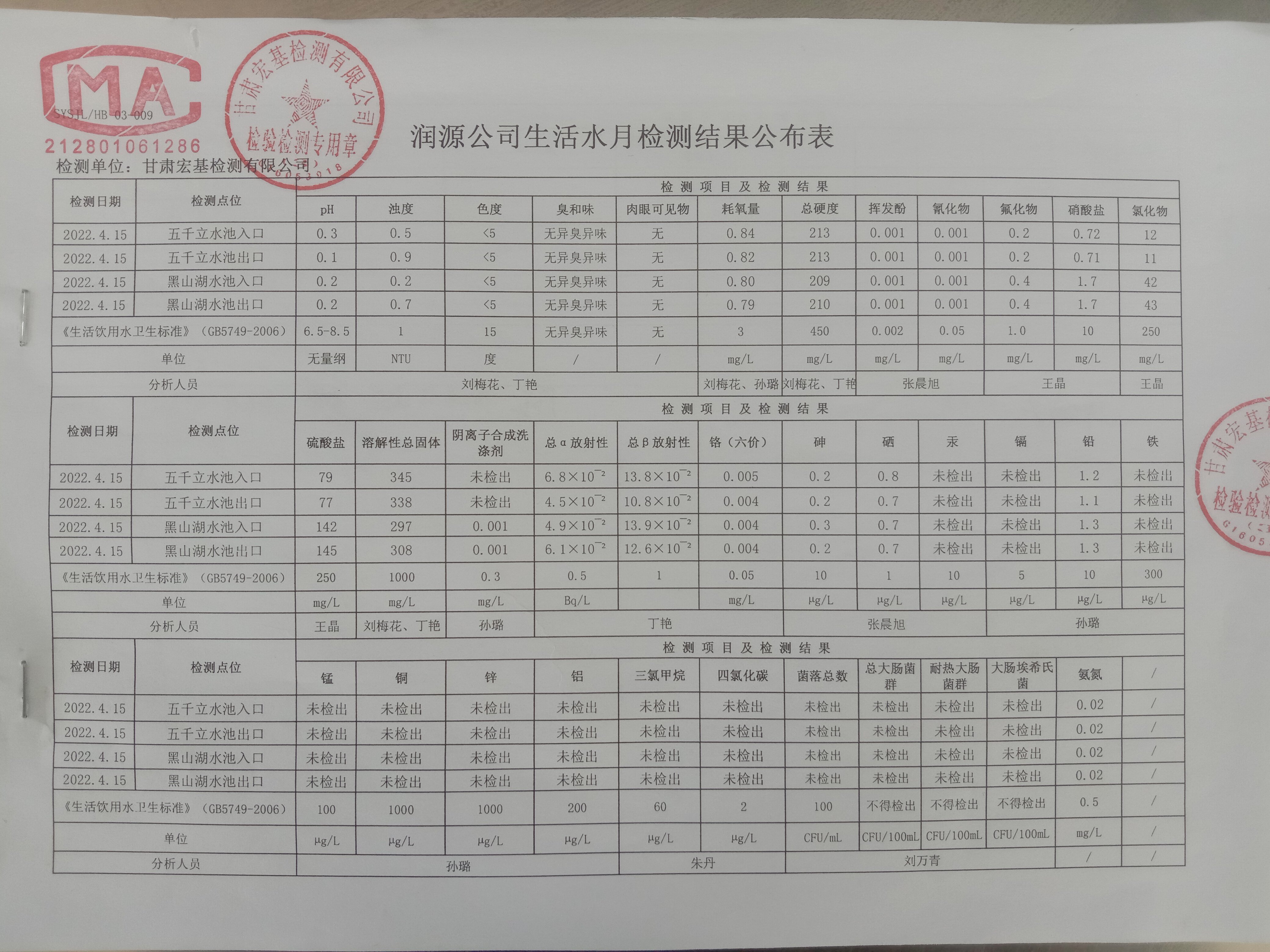 甘肅潤源環(huán)境資源科技有限公司水源地水質(zhì)二季度公示