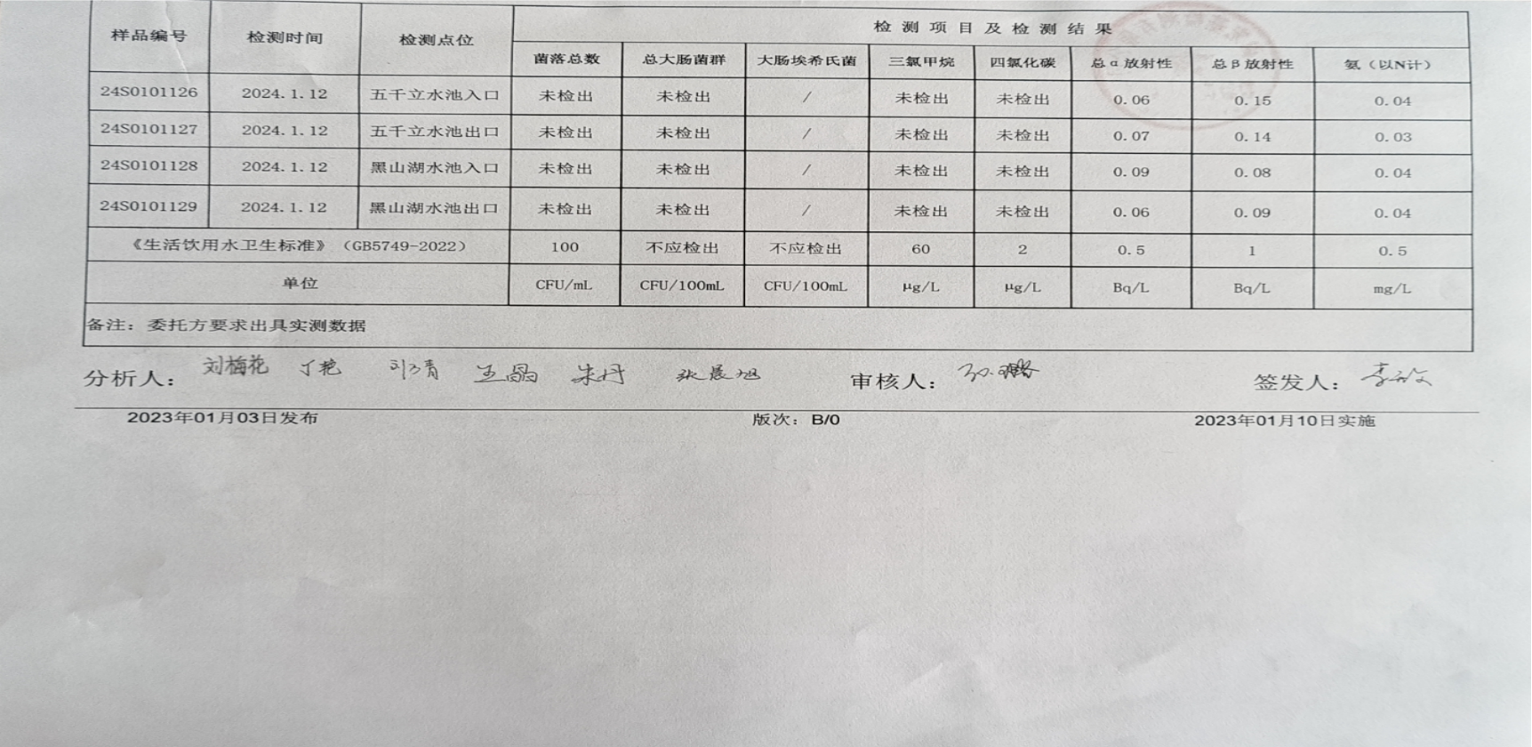 甘肅潤源環(huán)境資源科技有限公司水源地水質2024年第一季度公示