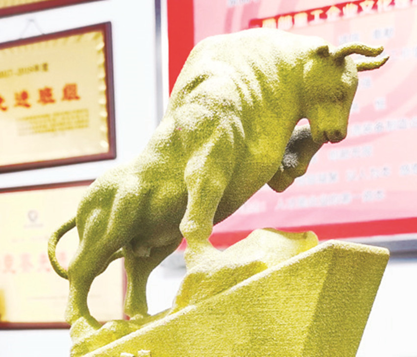 近日,西部重工公司精密鑄造分廠利用3D打印設(shè)備成功生產(chǎn)出“三牛”獎(jiǎng)杯,彰顯“牛市”動(dòng)感的形象,受到職工一致好評。該廠相關(guān)技術(shù)人員以“為民服務(wù)孺子牛、創(chuàng)新發(fā)展拓荒牛、艱苦奮斗老黃牛”“三牛精神”寓意為思路,通過設(shè)計(jì)、數(shù)字建模、打印、固化、上色,成功“打印”出牛氣沖天的雕塑獎(jiǎng)杯,用于該公司年度表彰,同時(shí)具備批量化、個(gè)性化生產(chǎn)的能力?! ⊥踹M(jìn) 周永虎 攝